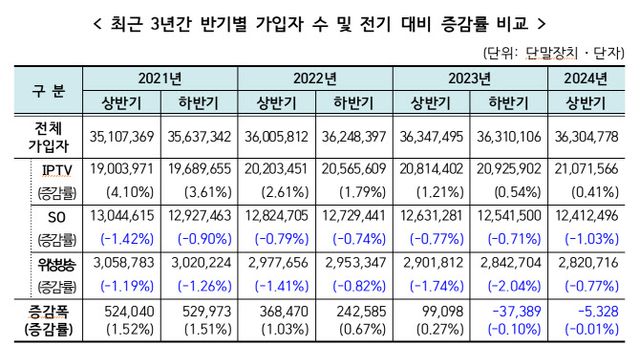 22일 과학기술정보통신부에 따르면 올해 상반기 유료 방송 가입자 수가 3630만4778명(단자)으로 지난해 하반기보다 5328명 줄어든 것으로 나타났다. 이는 지난해 하반기 가입자 수가 유료방송 가입자 수 집계를 시작한 2015년 이후 처음으로 감소한 뒤 연속 두 개 반기 감소세가 이어진 것이다. 다만, 감소폭은 지난해 하반기(3만7389명) 대비 둔화했다.