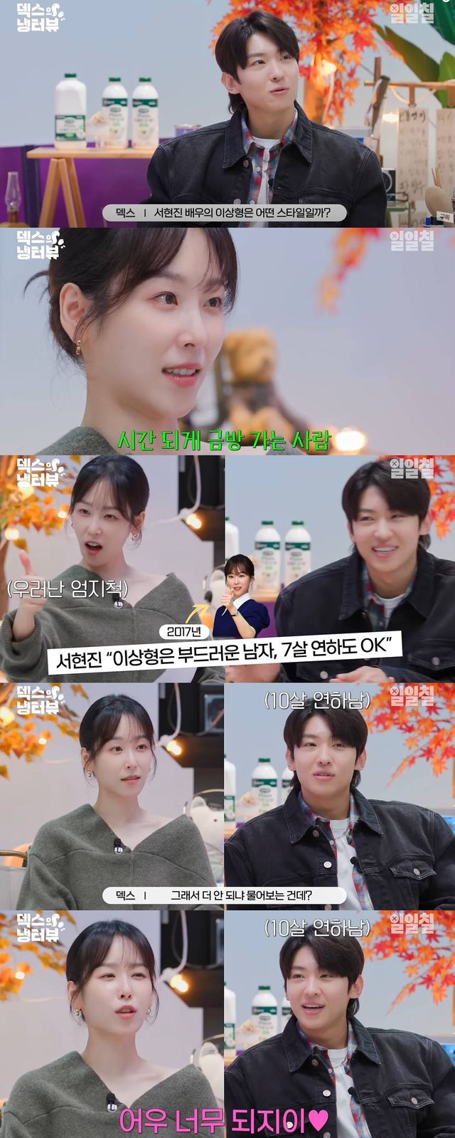 덱스는 서현진의 과거 이상형에 대해 "7살 연하도 OK라고 하더라. 요즘도 동일하냐"라고 물었다. 서현진은 "7살 보다 더 나가잖아"라며 덱스와의 나이차를 언급했다. 이들의 나이차는 10살.