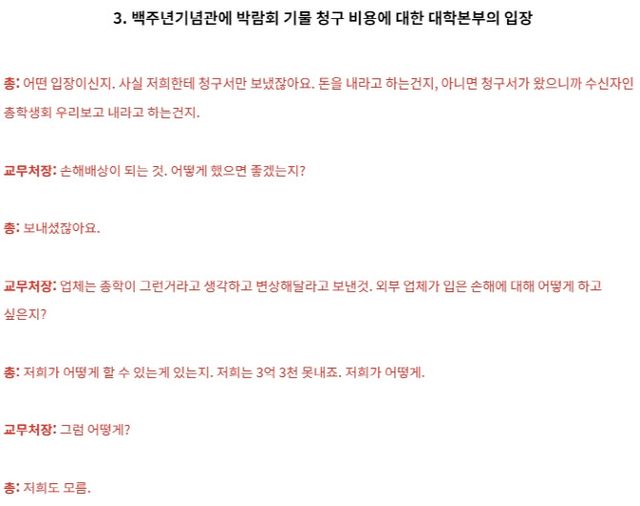 교무처장은 “업체는 총학생회가 그런 것이라 생각하고 변상해달라며 (청구서) 보냈다”고 했고, 이에 총학 측은 “3억3000만원 못 낸다”며 “저희가 어떻게(내느냐)”고 반문했다. 이에 교무처장이 “그럼 어떻게 하느냐”고 하자 총학 측은 “우리는 모른다”는 취지로 답했다.