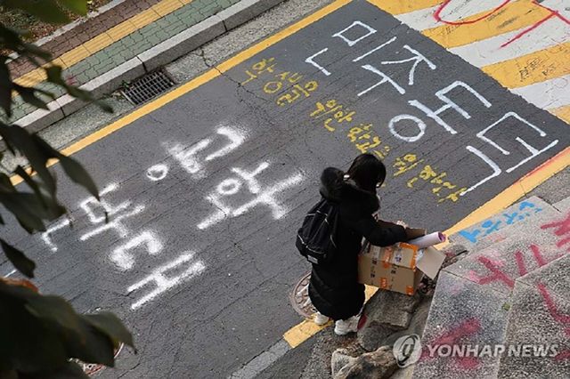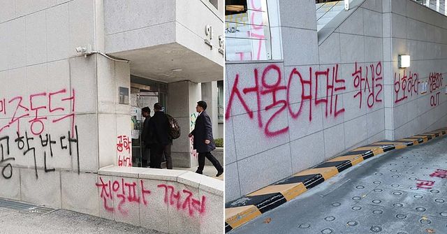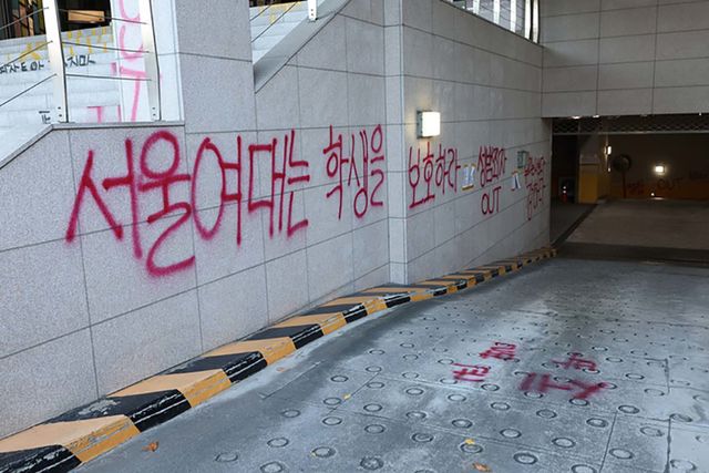17일 오후 서울 노원구 서울여대 50주년 기념관 일대에 성범죄 OUT 등의 항의 문구들이 래커로 칠해져 있다. / 연합뉴스