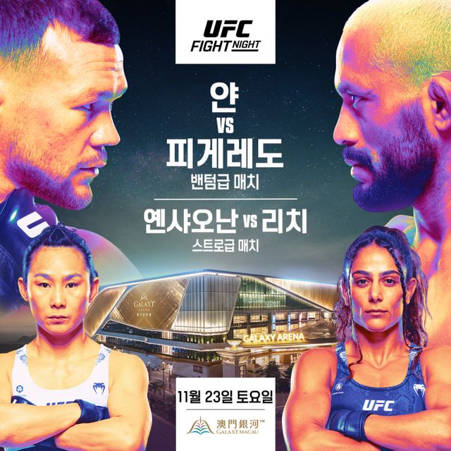 유수영과 최동훈이 출전하는 ‘UFC 파이트 나이트: 얀 vs 피게레도’ ROAD TO UFC 시즌 3 결승은 오는 11월 23일(토) 오후 6시부터 tvN SPORTS와 티빙(TVING)을 통해 생중계된다. 메인카드는 오후 8시부터 같은 플랫폼에서 연속으로 중계된다.