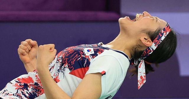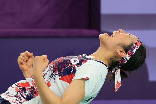 대한민국 배드민턴 대표팀 안세영이 지난 8월 5일 오후(한국시각) 프랑스 파리 라 샤펠 아레나에서 열린 2024 파리올림픽 배드민턴 여자 단식 결승 중국의 허빙자오 선수와의 경기에서 금메달을 확정 지은 후 기뻐하고 있다. / 뉴스1