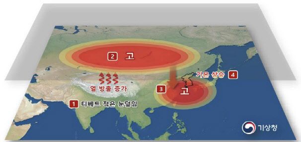 현재 바렌츠·카라해와 랍테프해의 해빙 면적은 평년보다 적은 상태이다. 두 지역의 해빙이 평소보다 적은 상태가 계속되면 해양에서 대기로 열에너지가 방출돼 기온이 오르고, 이로 인해 발달한 고기압의 가장자리를 따라 찬 공기가 동아시아로 유입돼 기온이 낮아질 수 있다. 이처럼 우리나라 부근에 고기압성 순환이 강화되면 대기가 안정돼 평년보다 강수량이 적을 것으로 전망된다.