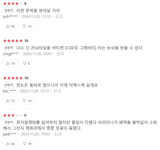 영화를 관람한 누리꾼들은 "진짜 미쳤네 파트 2 어떻게 기다리나?", "개봉하자마자 관람. 뮤지컬 작품으로 최고의 연출과 보이스인 듯", "한창 재밌어질 무렵에 뚝 끝나서 얼떨떨하면서도 아쉬웠습니다", "그냥 미쳤음 이 이상 형용이 불가함" 등과 같은 후기를 남겼습니다.