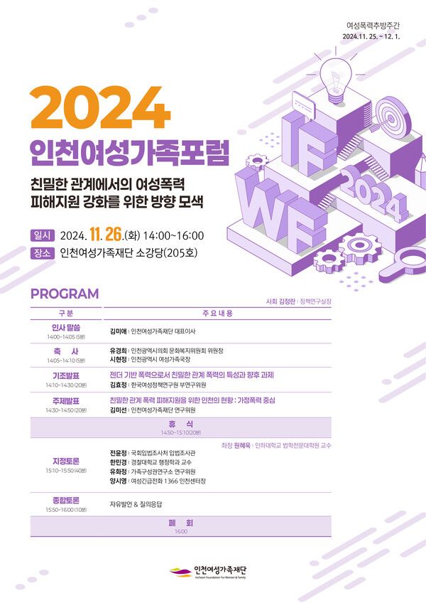 인천여성가족재단에 따르면 인천여성가족포럼은 2013년부터 11년간 지속됐으며 이번 포럼은 여성 폭력 추방 주간(2024.11.25~12.1)을 맞아 ‘친밀한 관계에서의 폭력’을 조망하기 위해 마련됐다.