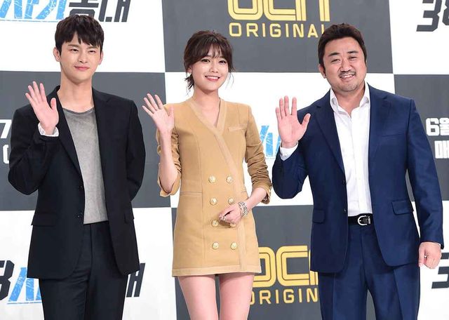 배우 서인국, 소녀시대 수영, 마동석(왼쪽부터)이 서울 영등포 타임스퀘어에서 열린 OCN 드라마 ‘38사기동대’ 제작발표회에 참석해 포즈를 취하고 있다. / 뉴스1