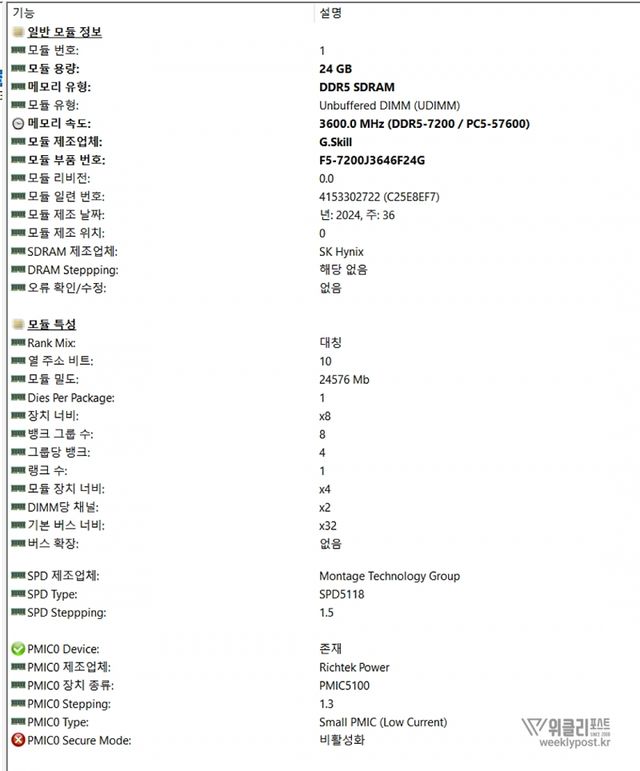 속도는 7200MHz에 CL36으로, 기본 클럭인 DDR5 5600MHz 메모리 대비 확연히 빠르다. 램 타이밍도 CL36-46-46으로 굉장히 빠른 편이며, 이 점은 시스템의 데이터 처리 속도에도 반영된다. 빠른 속도를 체감할 수 있으며, 안정성도 믿을 만하다. 고해상도 게임과 멀티태스킹 환경이 필요한 게이머와 크리에이터 모두에게 적합하다.