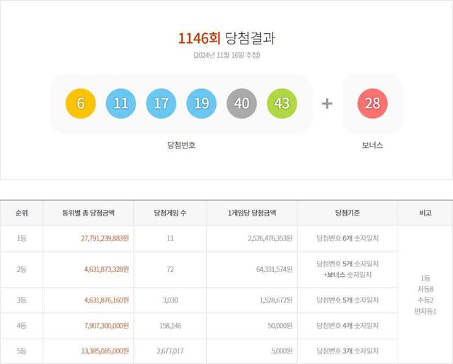 11월 16일 추첨 된 1146회 1등 당첨번호는 '6, 11, 17, 19, 40, 43' 보너스 번호는 '28' 번이다.