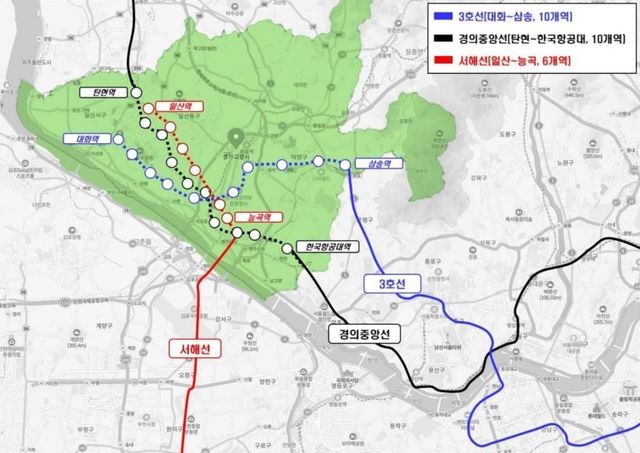 경의중앙선은 고양시 일산서구 탄현역에서 구리시 구리역까지, 서해선은 고양시 일산서구 일산역에서 서울 강서구 김포공항역까지, 4호선은 남양주시 진접역에서 과천시 정부과천청사역까지 이용 가능하다.