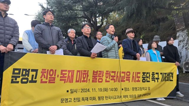 전교조·지역 시민단체·문명고 학부모 등으로 구성된 ‘문명고 친일·독재 미화, 불량 한국사교과서 채택대응 대책위원회’(이하 대책위)는 지난 22일 입장문을 발표, 문명고가 평가원 교과서 채택 관련 진행한 기자회견에 대해 교육의 중립성을 해쳤다며 비판하고 나섰다.