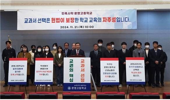 이에 문명고 임준희 교장을 비롯한 문명고 교사 20여명은 전날 오전 경북 경산시 문명고 옆 대신대학교에서 기자회견을 열고 “본교는 교과협의회 심의와 학교운영위원회 심의를 거쳐 최종적으로 원안을 통과시키는 절차를 준수해 교과서를 선정했다”며 “교과서 선정과 관련한 부당한 간섭과 편파 보도 등에 법적 책임을 묻겠다”고 밝힌 바 있다.