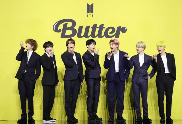 그룹 방탄소년단(BTS) 뷔(왼쪽부터), 슈가, 진, 정국, RM, 지민, 제이홉이 2021년 5월 21일 서울 송파구 방이동 올림픽공원 올림픽홀에서 열린 새 디지털 싱글 'Butter' 발매 기념 글로벌 기자간담회에 앞서 포즈를 취하고 있다. / 뉴스1