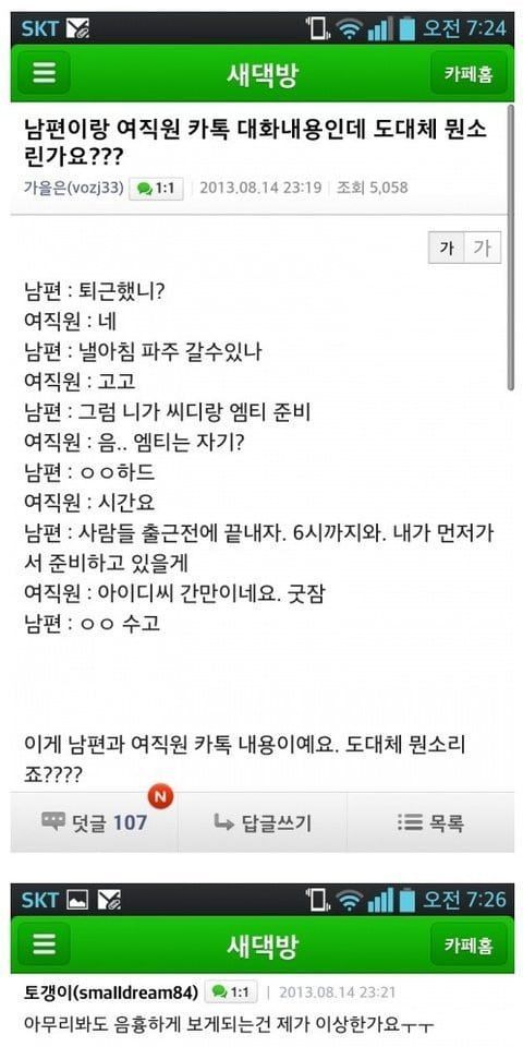 남편이랑 여자직원 카톡 대화내용인데 도대체 뭔소린가요???