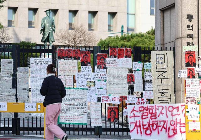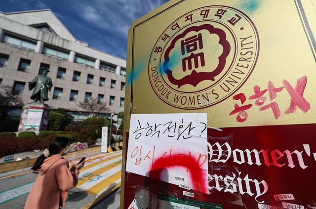 19일 서울 성북구 동덕여자대학교 교내에 학교 측의 남녀공학 전환 논의를 규탄하는 문구들이 적혀 있다. / 뉴스1
