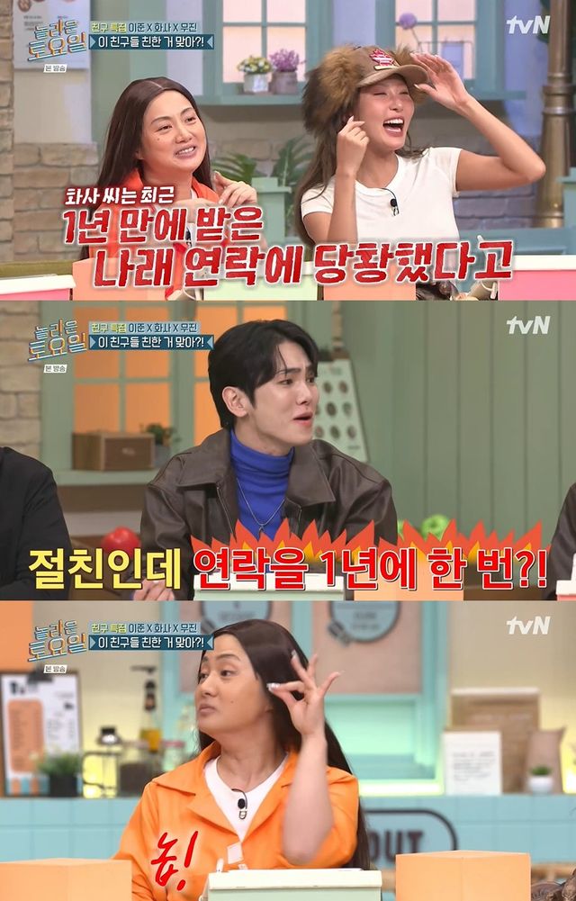 이날 화사는 1년 만에 받은 박나래의 연락에 당황했다고 밝혔고, 멤버들은 절친인데 연락을 1년 만에 하냐고 아우성쳤다.
