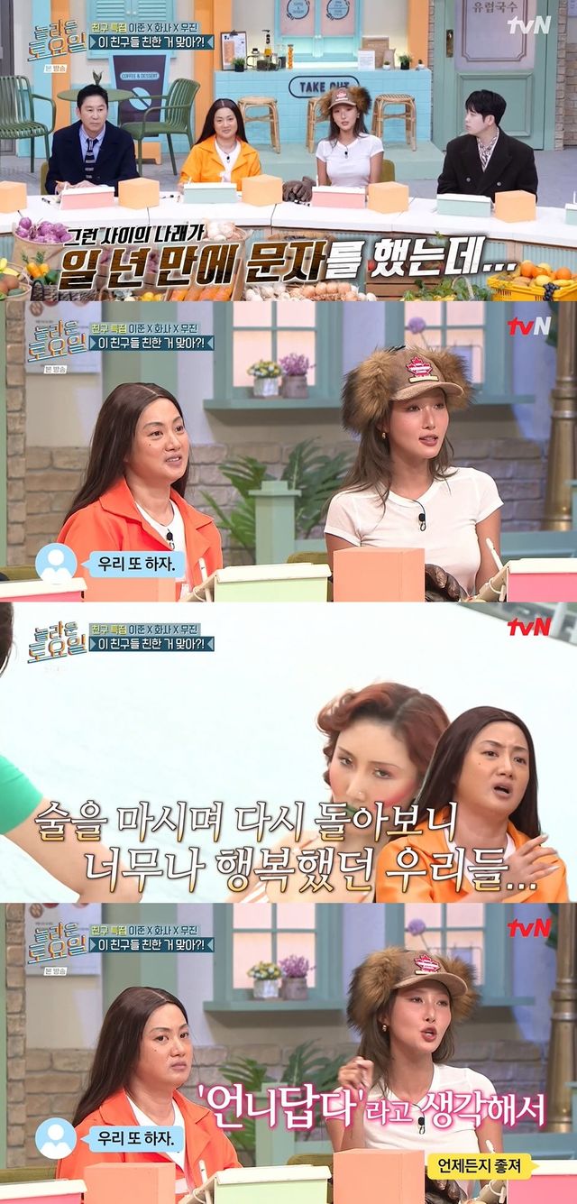 이어 화사는 "근데 1년만에 '우리 또 하자'라고 주어 다 떼고 문자가 왔다"며 박나래와의 에피소드를 공유했다.