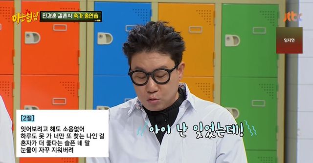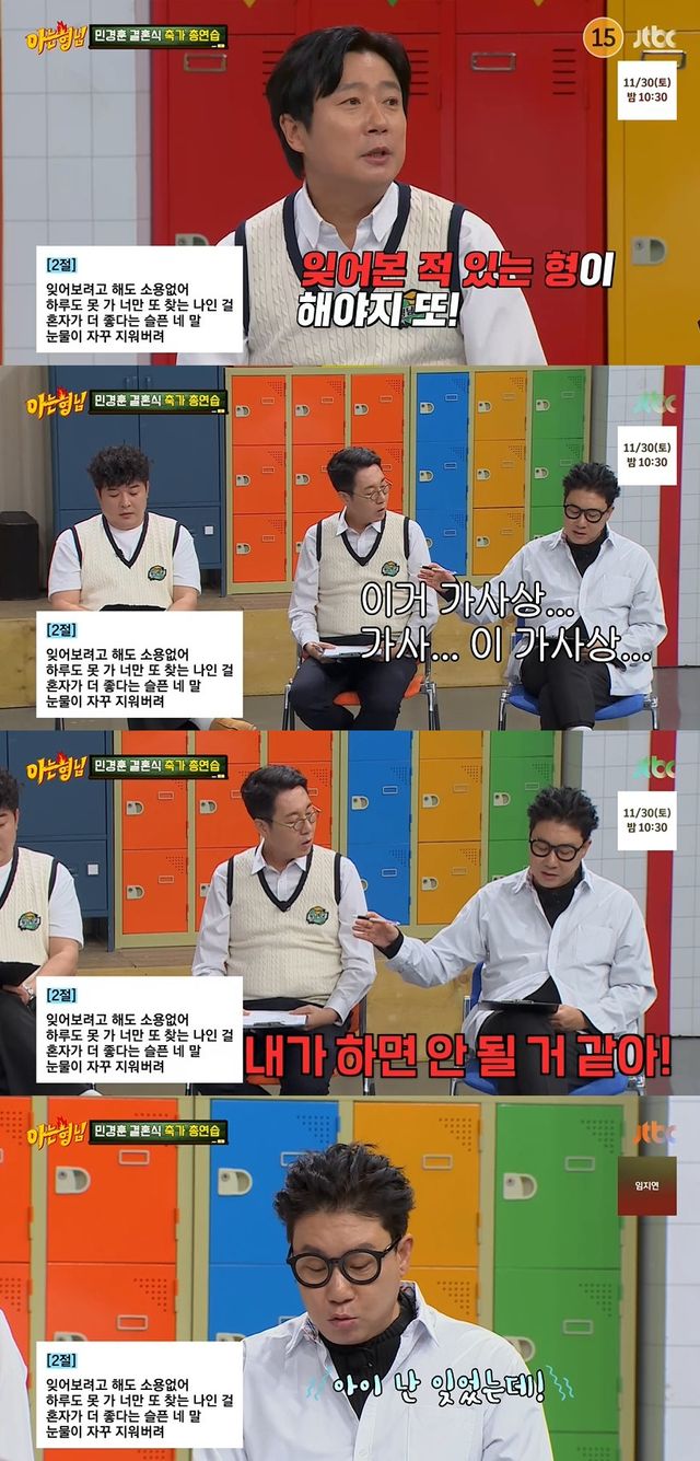 이수근은 "잊어본 적 있는 형이 해야된다"라고 추천했고, 가사를 살핀 이상민은 "가사상 내가 하면 안될 것 같다"고 거절하더니 "난 잊었다"고 발끈하며 선을 그었다.