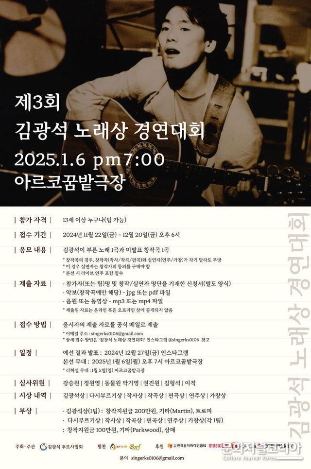 22일 김광석추모사업회(회장 강승원)에 따르면, 김광석 29주기인 내년 1월6일 서울 대학로 아르코꿈밭극장에서 '제3회 김광석 노래상 경연대회'가 열린다. 김광석추모사업회는 1996년 2월 고(故) 가객 김광석(1964~1996)의 49재 추모 콘서트(연세대 대강당) 참가자 40여 팀을 중심으로 만들어졌다.
