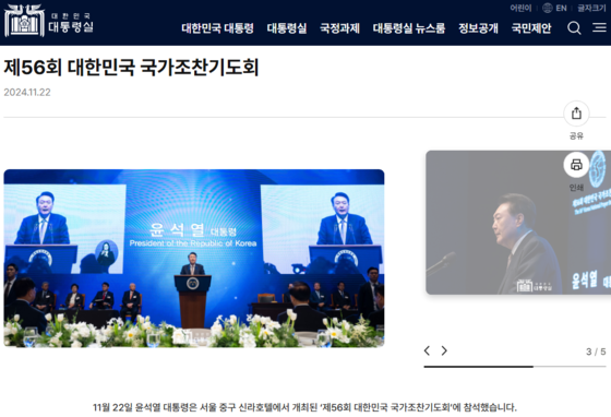 한편 대한민국 국가조찬기도회는 초교파적 기독교 성도들이 모여 국가와 국민을 위해 기도하며 화합과 희망을 다짐하는 자리로 1966년 시작했고, 윤 대통령은 지난 2022년 12월에 이어 취임 이후 두 번째로 참석했다.