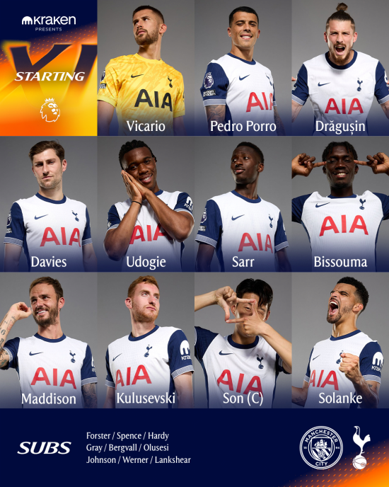 원정팀 토트넘은 4-2-3-1 전형으로 맞섰다. 굴리에모 비카리오 골키퍼를 비롯해 페드로 포로, 라두 드라구신, 벤 데이비스, 데스티니 우도기가 수비를 구축했다. 3선은 파페 사르와 이브 비수마가 지켰다. 2선은 데얀 쿨루세브스키, 제임스 매디슨, 손흥민,, 최전방에 도미니크 솔란키가 나와 득점을 노렸다.