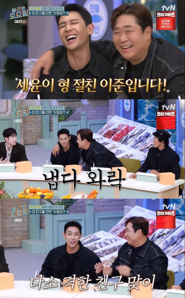 이어 이준은 ‘놀라운 토요일’에 나오기 전 문세윤에게 절친 강요를 당했다고 밝혀 웃음을 자아냈다. 이준은 "'놀라운 토요일' 절친 섭외를 받고 '1박 2일'에서도 저를 절친이라고 부른다. 그때부터 이름을 안 부르고 절친이 됐다"고 덧붙이며 문세윤과의 절친 관계가 확립된 배경을 설명했다.