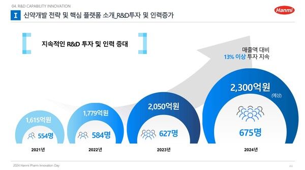 한미약품이 발표한 자료에 따르면 올해 한미약품의 R&D 투자 비용은 2300억원으로 예상된다. 지난 3년간 R&D 투자액을 보면 2021년 1615억원, 2022년 1779억원, 2023년 2050억원으로 매출액 대비 13% 이상 지속적으로 투자한 것이다. R&D 인력 또한 지난 2021년 554명에서 올해 675명으로 꾸준히 늘려왔다.