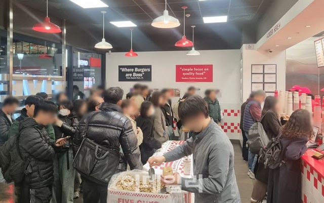 파이브가이즈가 국내에 첫 선을 보인지 1년이 지났지만 인기는 여전한 분위기다. 파이브가이즈는 1996년 미국 버지니아에서 시작한 햄버거 브랜드다. 패티와 생감자를 땅콩기름에 튀겨내는 것이 특징이다. 쉐이크쉑, 인앤아웃 등과 함께 미국의 3대 버거 브랜드로 꼽힌다. 김승연 한화(000880)그룹 회장의 3남인 김동선 한화호텔앤리조트 부사장이 지난해 6월 국내로 들여왔다.