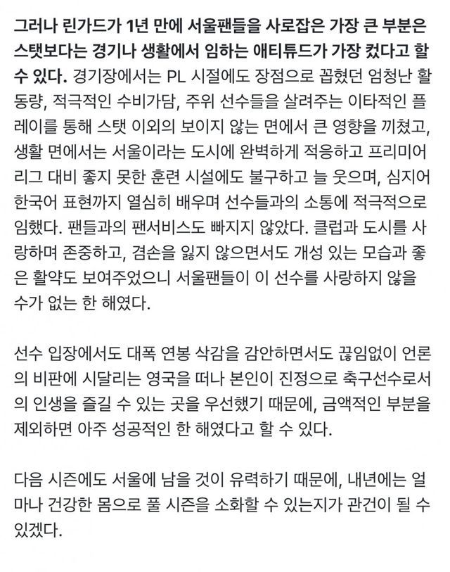 슈퍼스타 린가드를 품을 수 있어서 행복한 한 해였다