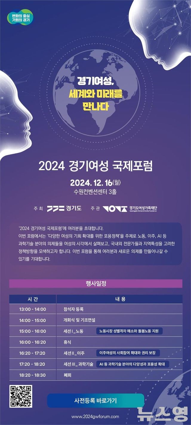 (경기=뉴스영 공경진 기자) 경기도는, 오는 16일 수원컨벤션센터에서 국내외 전문가들과 함께 ‘2024 경기여성 국제포럼’을 개최하며, 여성의 기회 확대를 위한 포용정책을 논의한다.