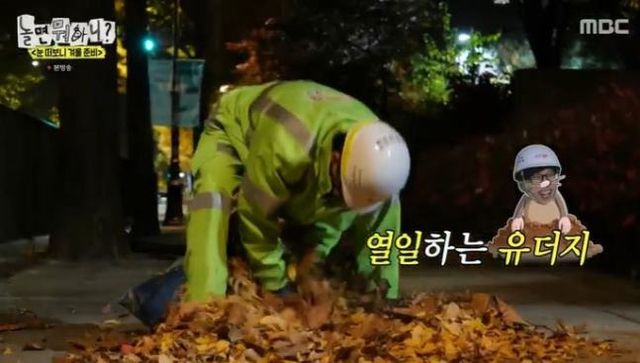새벽 4시 청소를 시작한 유재석은 환경공무관에게 ‘두더지 권법’ ‘낙엽 장풍 쏘기’ 노하우를 전수받았다. 두더지로 변신한 유재석은 낙엽을 박박 쓸어 담으면서, 친구 김석훈에게 “네가 ‘쓰저씨’여도 이건 몰랐을 거다”라며 두더지 권법을 전파했다.