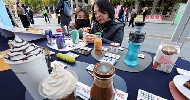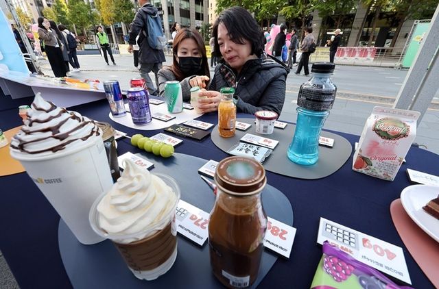 서울 중구 청계광장에서 서울시 주최로 열린 '저당 실천 대시민 캠페인'에서 시민들이 평소 섭취하는 음료를 비롯한 식품에 함류된 당의 양을 확인하고 있다. 이번 캠페인은 '덜 달달 9988' 프로젝트의 일환으로 서울시민의 당류 섭취를 줄이고 건강한 식습관 형성을 돕기 위해 마련됐다. / 뉴스1