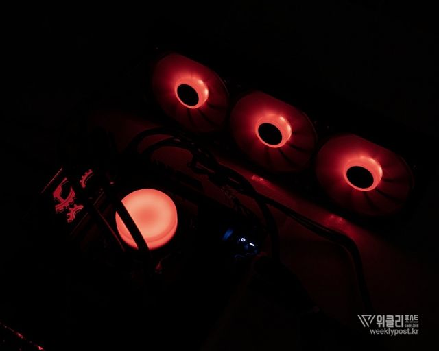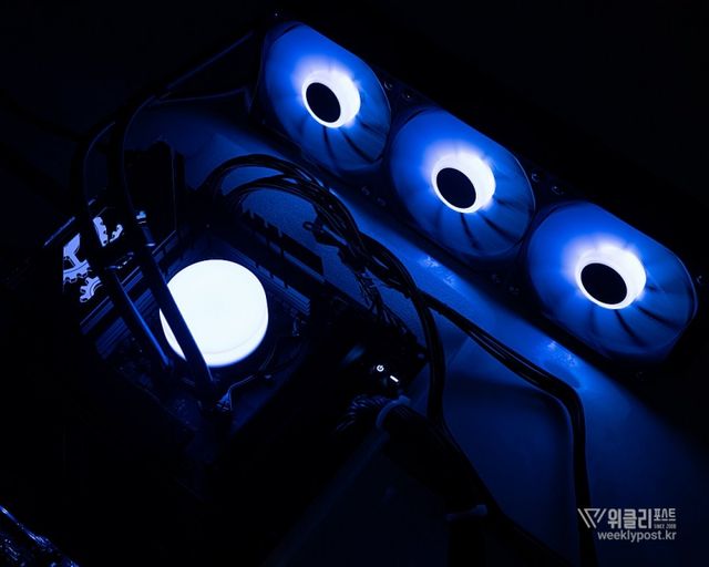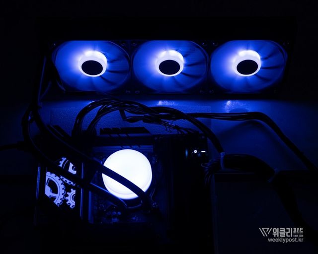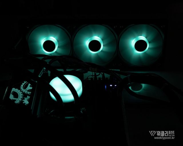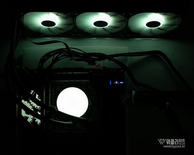 일체형 360mm 쿨링팬을 사용하면 이 같은 모든 과정이 한결 쉽고 편해진다. 하나의 전원 커넥터와 하나의 ARGB 커넥터만 연결하면 3개의 쿨링팬이 함께 동작하는 것은 물론, ARGB 효과도 동기화된다. 조립 후 케이블 정리 역시도 훨씬 수월하다. 쿨링팬이 라디에이터에 장착된 상태로 출고되므로 장착도 한결 수월하다.