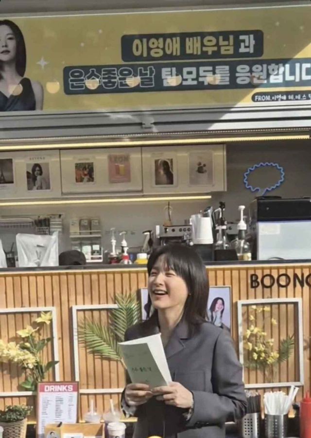 이영애는 촬영 중 스태프들에게 감사의 마음을 전하며 밝은 미소를 보였다. 지난달 10일, SNS에 "언제나 감사 감사"라는 글과 함께 커피차 앞에서 찍은 사진을 공개했다. 사진 속 이영애는 그레이 색상의 세련된 재킷과 블랙 팬츠로 간결한 스타일을 완성했다. 자연스러운 포즈와 깔끔한 옷차림이 그녀의 우아한 이미지를 강조했다.