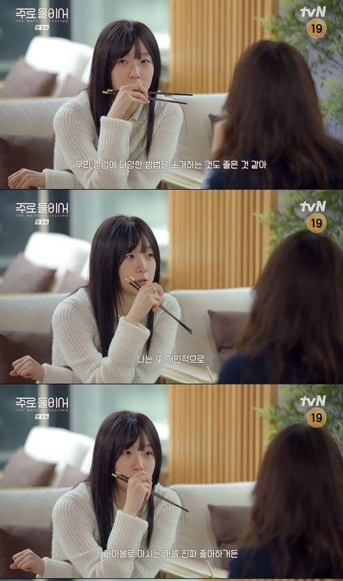 김고은은 "돌멍게랑 16년산이랑 너무 잘 맞아"라고 하는데 이어, 닭발을 먹어보더니 "너무 맛있다"라며 연신 감탄했다.