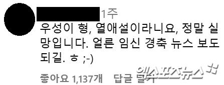 또한 열애설 부인 당시 한 SNS 사용자는 정우성의 개인 채널에 "우성이 형, 열애설이라니요, 정말 실망입니다. 얼른 임신 경축 뉴스 보도 되길. ㅎ"라는 댓글을 남겼고, 해당 글이 다시 조명되는 등 온라인에서 뜨거운 반응을 자아내고 있다.