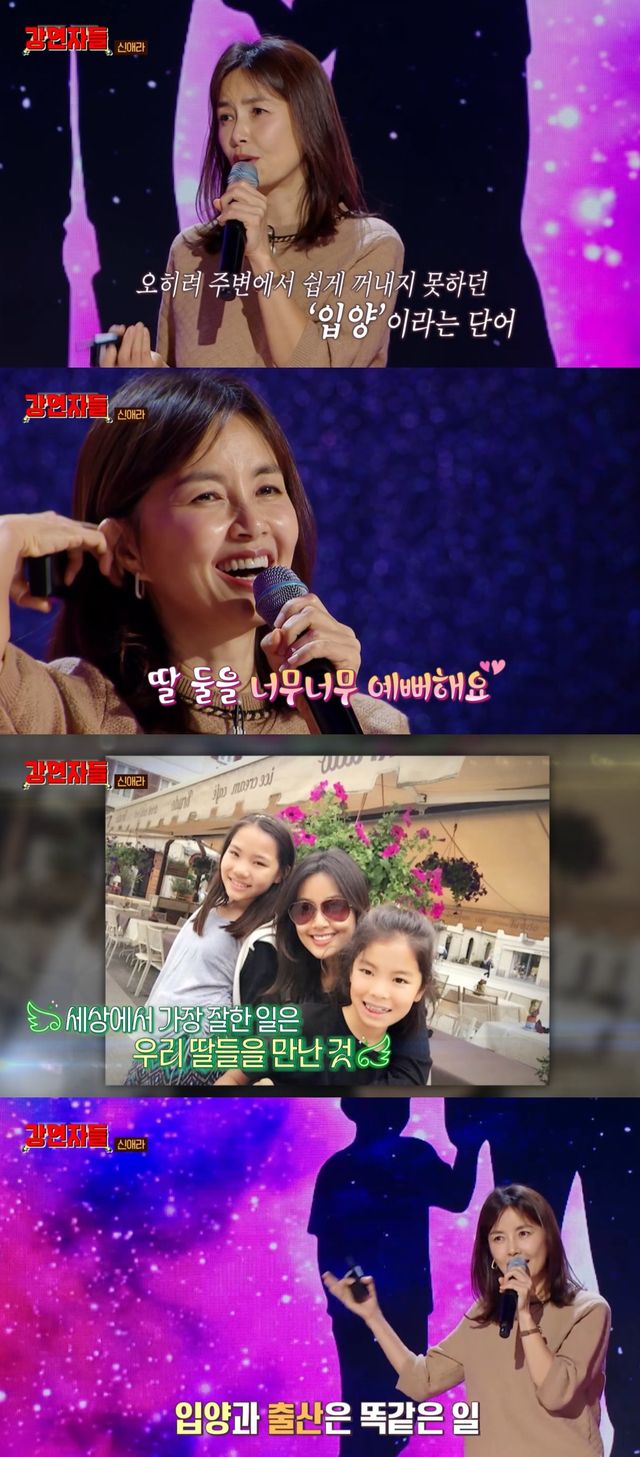 이날 신애라는 두 딸을 입양해 키우고 있는 근황을 전했다. 그는 "전 아들을 낳고 딸 둘을 입양했다. 큰 딸은 태어난지 1달도 안돼 우리집에 왔다. 그런데 기저귀가 흠뻑 젖었는데도 울질 않더라"라고 운을 뗐다.