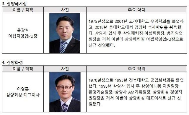이외에도 삼양그룹은 이번 인사에서 외부 영입을 제외한 신규 임원 6명 중 3명을 40대로 구성하고 그룹의 핵심적인 역할을 맡게 했다. 삼양그룹은 "연공서열을 탈피하고 성과 중심으로 전문성과 리더십이 차별화된 인력 발탁에 초점을 맞췄다"고 밝혔다. 이번 정기 임원인사는 12월1일 시행 예정이다.
