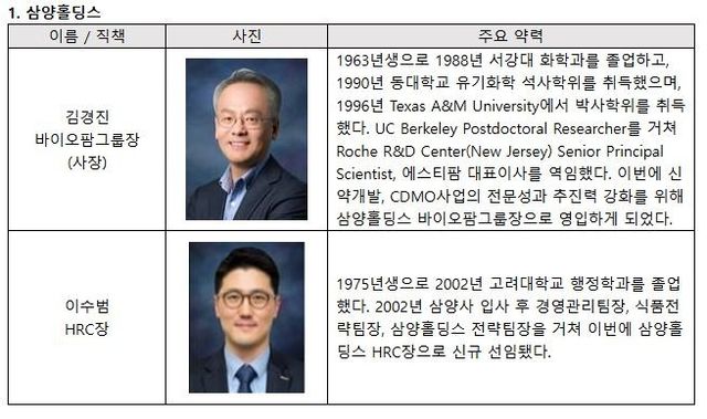바이오팜그룹은 전 에스티팜 대표였던 김경진 사장을 영입해 그룹장으로 신규 선임했다. 김경진 그룹장은 글로벌 제약사 로슈의 수석연구원을 거쳐 에스티팜에서 합성1연구부장, 연구소장, 대표이사 등을 역임하며 연구개발자로서는 물론 전문 경영인으로서도 우수한 역량을 갖췄다는 평가를 받고 있다. 이번에 삼양홀딩스(000070) 바이오팜그룹장으로 선임돼 글로벌 시장을 확대하고, 위탁개발생산(CDMO) 전문성 강화와 mRNA 전달체 연구개발에도 속도를 높일 전망이다.