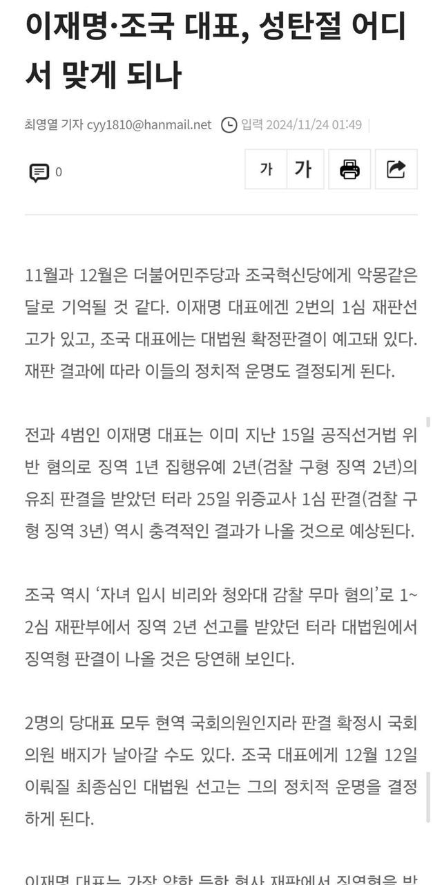 이재명·조국 대표, 성탄절 어디서 맞게 되나