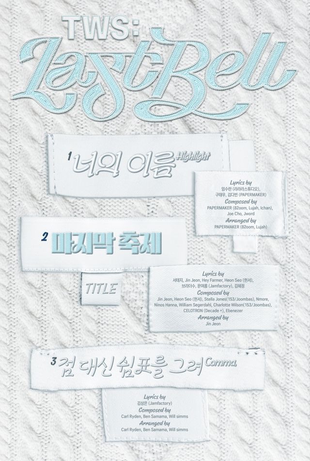 신보에는 타이틀곡 '마지막 축제'를 비롯해 '너의 이름 (Highlight)', '점 대신 쉼표를 그려 (Comma,)' 총 세 곡이 실린다. TWS의 한층 폭넓어진 음악 스펙트럼과 새로운 퍼포먼스 스타일이 예고됐다.
