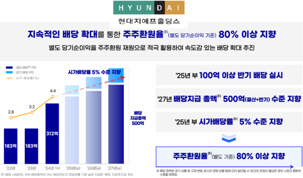 또 2025년부로 반기 배당 최소 100억원 이상 시행하고, 배당 지급총액을 400억원 수준으로 확대해 2027년까지 500억원 수준으로 확대하겠다는 계획이다.