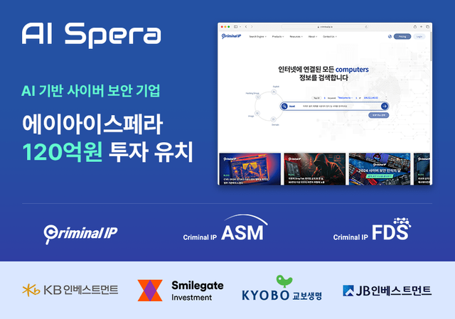 AI 기반 사이버 보안 기업 에이아이스페라(AI SPERA, 대표 강병탁)가 120억 원 규모의 추가 투자를 유치했다고 25일 밝혔다. 이로써 에이아이스페라의 누적 투자금액은 230억 원을 기록하게 됐다.