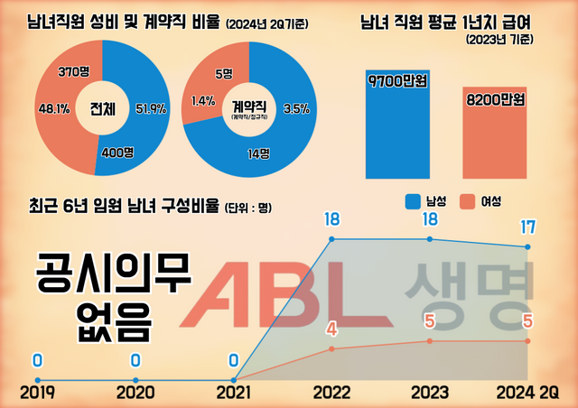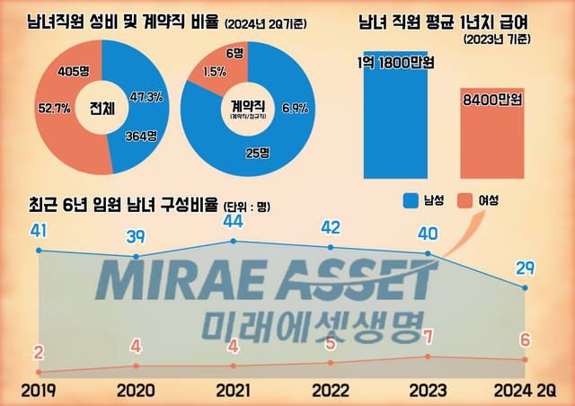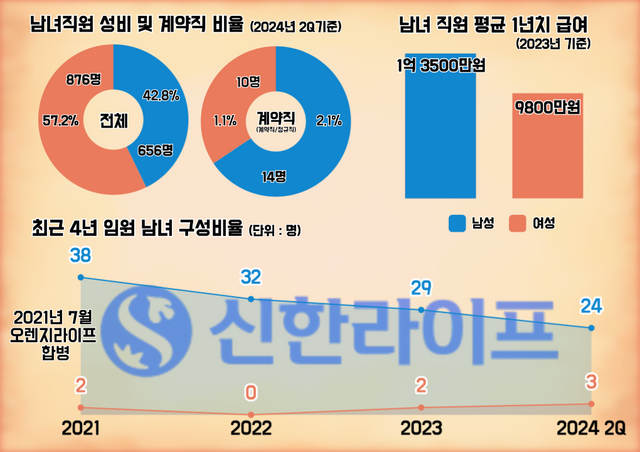 NH농협생명이 17.5%로 여성 계약직 비율이 가장 높았으며, 지난해 기준 동양생명이 5700만원으로 가장 큰 남녀 임금격차를 보였다.