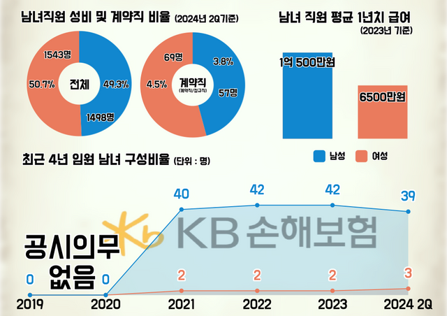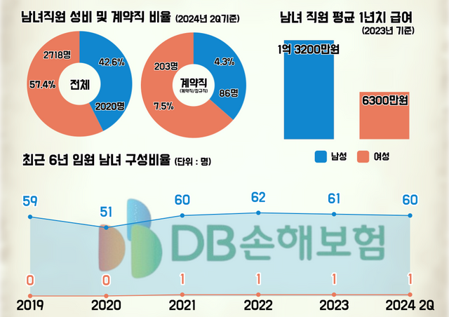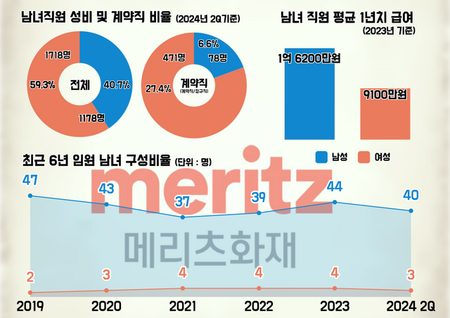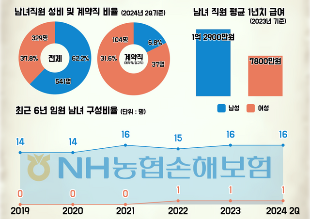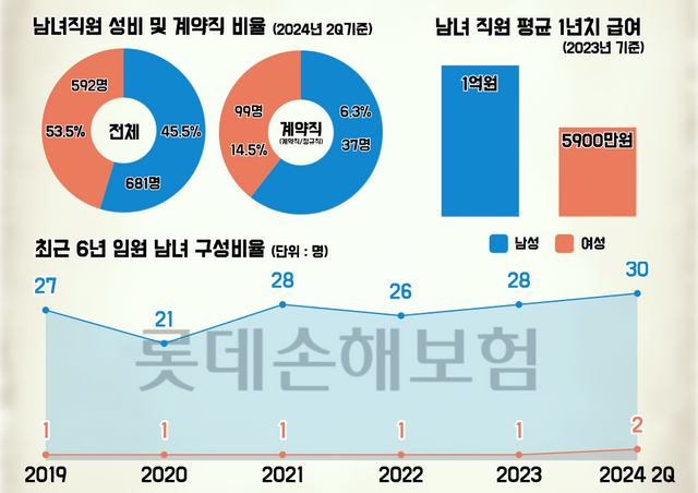 NH농협손해보험이 31.6%로 여성 계약직 비율이 가장 높았으며, 지난해 기준 메리츠화재가 7100만원으로 가장 큰 남녀 임금격차를 보였다.
