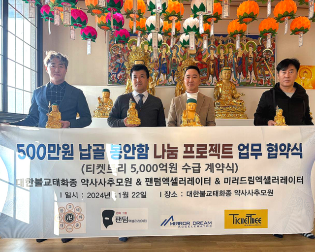 [파이낸셜경제=김지훈 기자] 대한불교 태화종(종정 청덕 스님)은 종단에서 운영하는 약사사봉안당(대표 윤종윤)의 개인 불상 봉안함(500만원), 부부 불상 봉안함(800만원)에 대해서 팬텀엑셀러레이터(대표 엑셀러레이터 김세훈, 파트너 엑셀러레이터 변호사 이기영)&미러드림엑셀러레이터(대표 김호석)와 나눔 프로젝트를 진행한다. 이에 지난 22일 문경 약사사봉안당에서 티켓트리 운영사인 팬텀엑셀러레이터와 모바일상품권 티켓트리 5,000억원 수급 계약을 체결하였다고 26일 밝혔다.