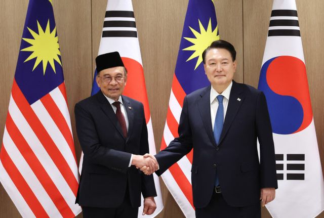 윤석열 대통령은 25일 서울 용산 대통령실 청사에서 한국을 공식 방문 중인 안와르 이브라힘 말레이시아 총리와 정상회담을 했다. 말레이시아 총리가 한국을 찾은 건 2019년 마하티르 빈 모하맛 전 총리 이후 5년 만이다.