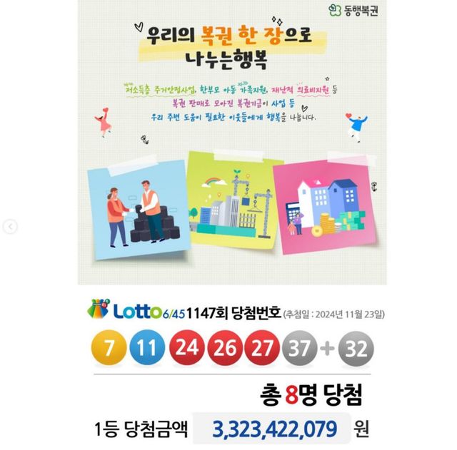 2024년 11월 23일 추첨한 로또6/45 제1147회 당첨번호. / 동행복권 공식 인스타그램