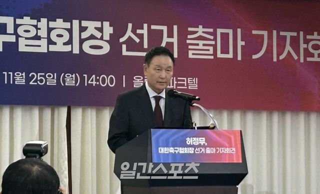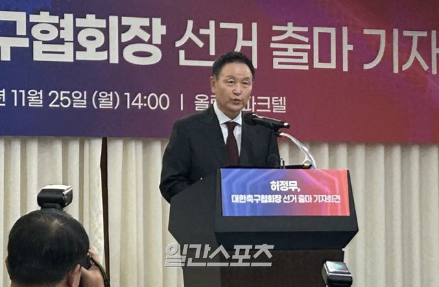 허정무 전 이사장은 25일 서울 송파구 올림픽파크텔 아테네홀에서 대한축구협회장 출마 기자회견에서 “지금 이 순간 떨리는 마음으로, 기도하는 마음으로 이 자리에 섰다. 모두가 축구협회의 환골탈태를 바라지만, 거대한 장벽 앞에서 누구도 선뜻 나서지 못해 왔다. 그래서 나는 이제 더 이상 방관자로 남지 않기로 했다”고 속내를 밝혔다.