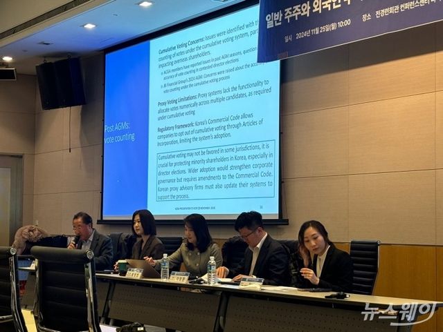 이 대표 역시 주주총회 소집 통지 기간 4주 전까지 연장, 의결권 접수 기간 확대, 해외 의결권 행사 업체에 집중투표 의결권이 제대로 행사될 수 있도록 의무 부여, 서류 요건 간소화 등의 제도적 개선을 해결책으로 제시했다.