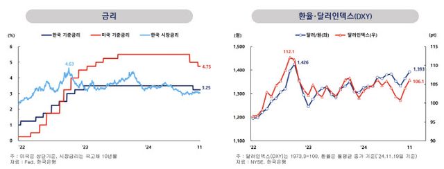 환율도 미국 물가의 재상승 가능성과 지정학적 불안의 장기화로 강달러 기조를 유지할 것으로 내다봤다. 트럼프 정부의 포괄적 보편적 관세 부과, 재정지출 확대 등이 미국 물가 상방 요인으로 작용해 연방준비은행의 통화정책 속도 조절 가능성도 있을 것으로 예상했다.